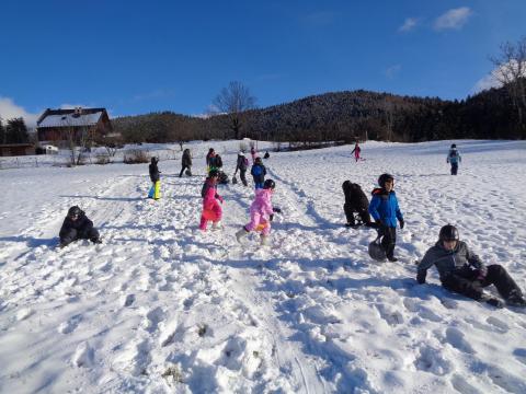 Pour se remettre de toutes ces émotions, nous sommes partis profiter du soleil pour des glissages endiablées de luge, une -première- bataille de boules de neige et un concours de sculptures de neige d'animaux fantastiques.