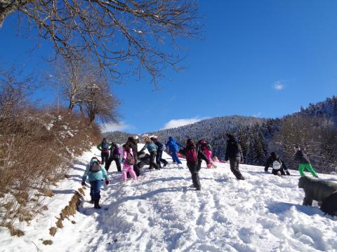 L’après-midi, nous avons fait la connaissance de Marine. Elle est guide de moyenne montagne et elle nous a emmené pister les animaux sauvages à côté du centre et dans la forêt surplombant Villard-de-Lans. Le début de la sortie était très pentu et il en a fallu de peu pour que le rêve se transforme en cauchemar. Mais Marine a deux dons (en plus de reconnaitre du premier coup d’œil une trace dans la neige et d'annoncer qu'il s'agit d'un chevreuil passé ce matin...). C'est une compteuse hors pair de légendes locales à faire frémir les plus téméraires, c'est aussi une bruiteuse d'exception. Et lorsqu'elle mélange légende et bruitage, il n'y a personne qui ne pense à envoyer des boules de neige aux copains.