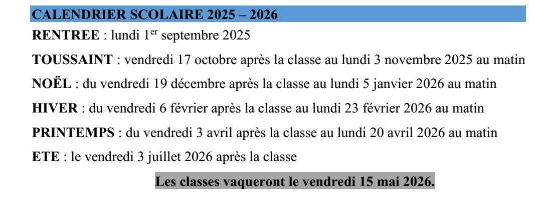 La reprise des cours pour l'année 2025 - 2026 se fera le lundi 1er septembre de 8h20 à 8h30.